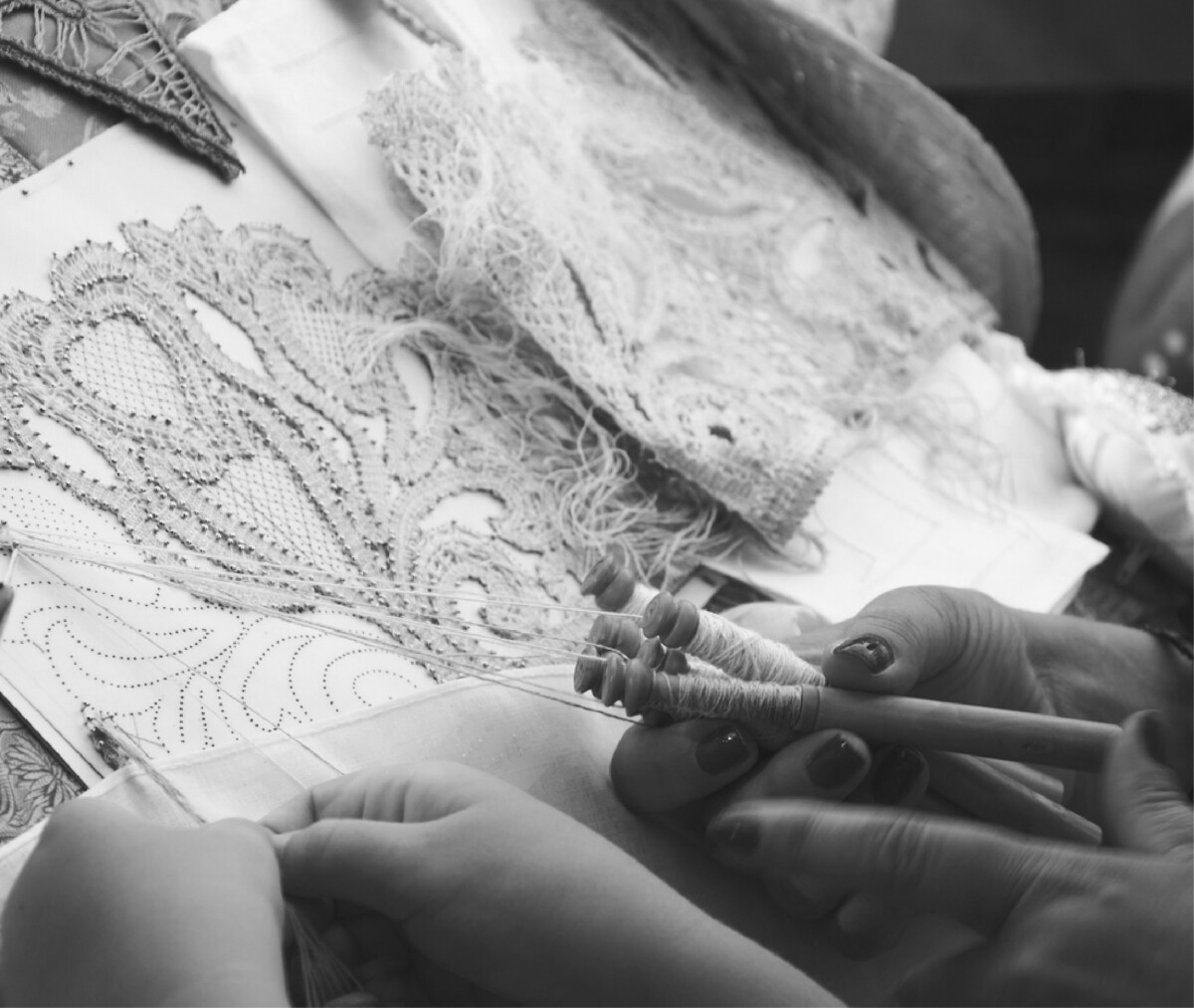 Accanto a me vive una rete di donne: merlettaie, sarte, ricamatrici. Mani esperte che custodiscono saperi antichi. Insieme portiamo avanti un progetto che è arte, ma anche responsabilità sociale. Sosteniamo il lavoro femminile, preserviamo tradizioni artigianali, intrecciamo storie di resilienza.