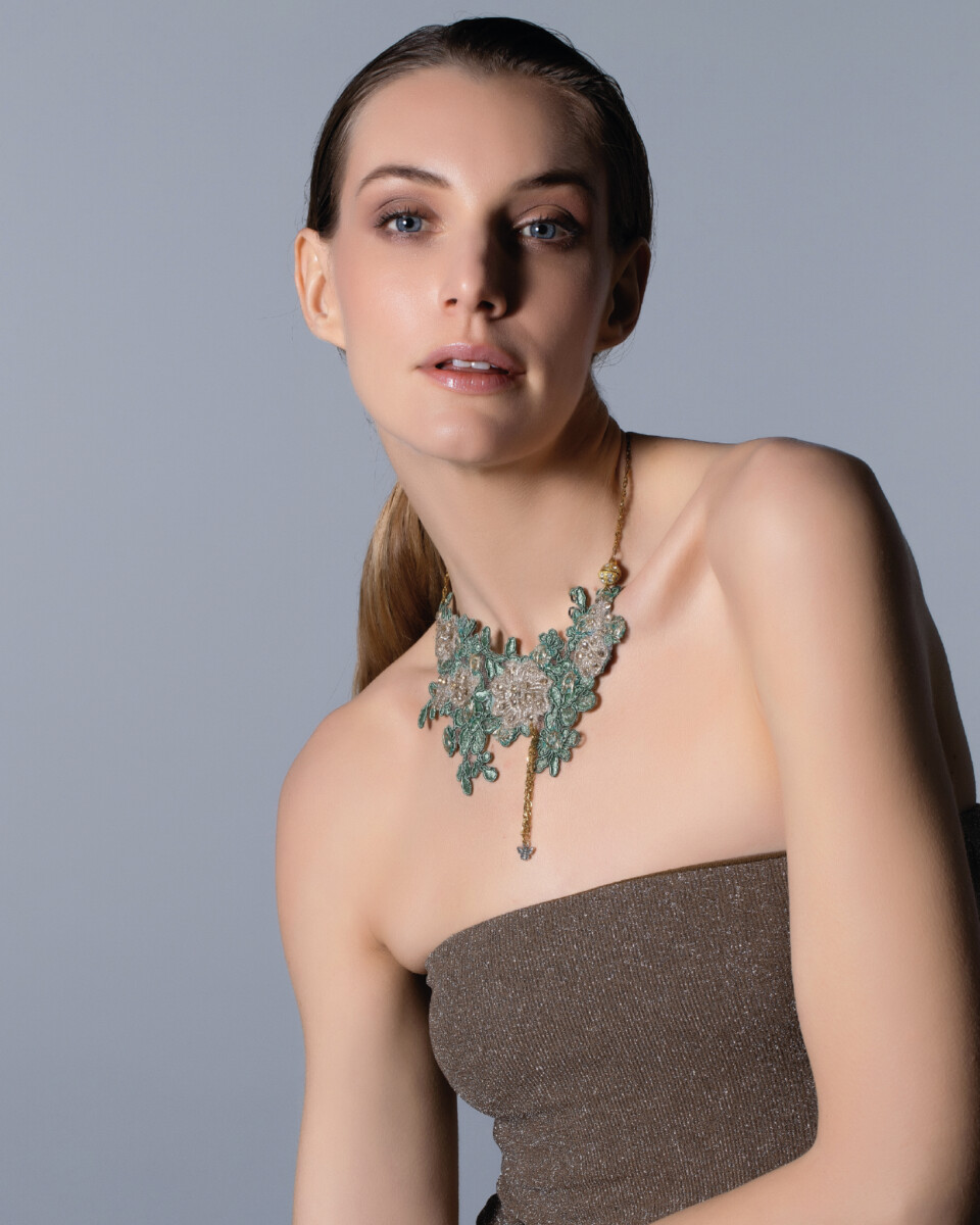 Una collana leggera e versatile, realizzata con un mix di merletti a base di tulle, confortevole da indossare, ipoallergenica e facile da trasportare, perfetta anche per i viaggi.