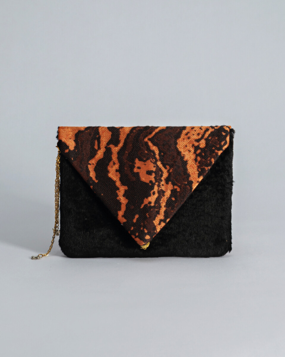 Questa versione abbina una stoffa arancio e nera a una base in materiale spesso effetto pelliccia, selezionata per il suo forte impatto materico e visivo. Perfetta per rossetti, piccoli oggetti, carte o contanti, può essere portata a mano o inserita in borse più grandi e valigie.