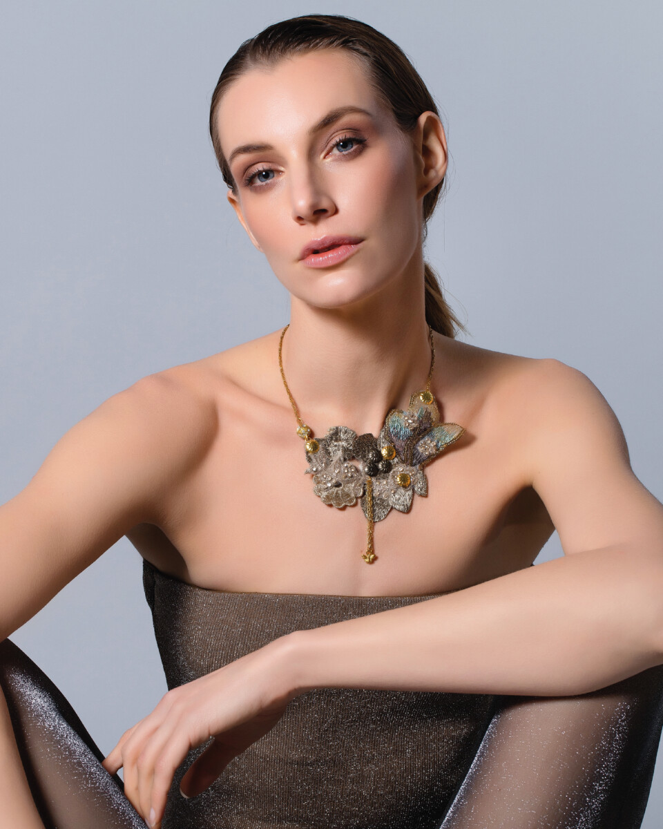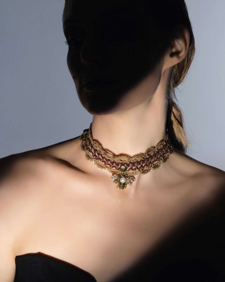 Una collana aderente al collo realizzata interamente a mano con passamanerie uniche e preziose, composte da sottilissimi filati semimetallici. All’interno, un nastro di velluto nero funge da chiusura a fiocco regolabile, unendo comfort e stile.