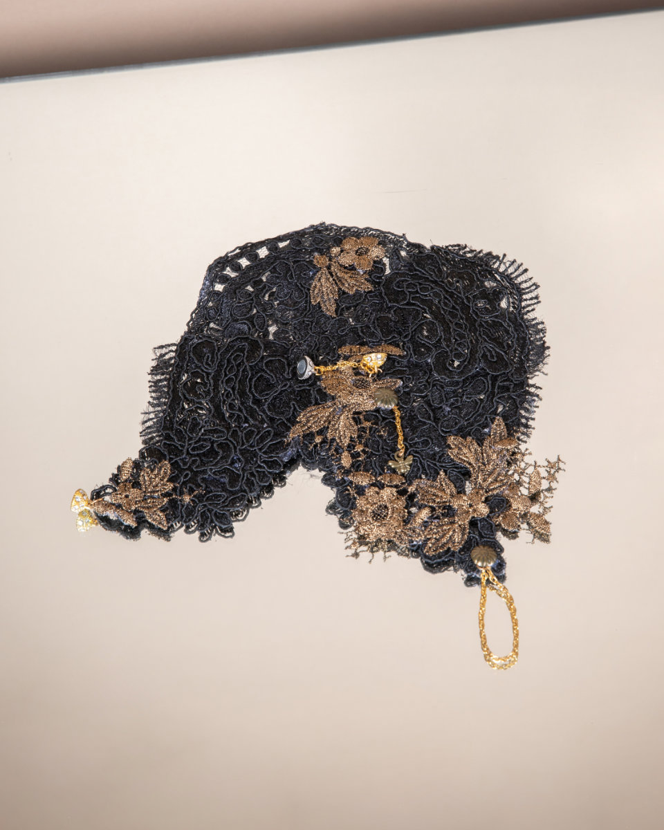 Gioiello ornamentale realizzato a mano con tecnica di upcycling, utilizzando diverse tipologie di merletti preziosi e antichi, spesso introvabili.