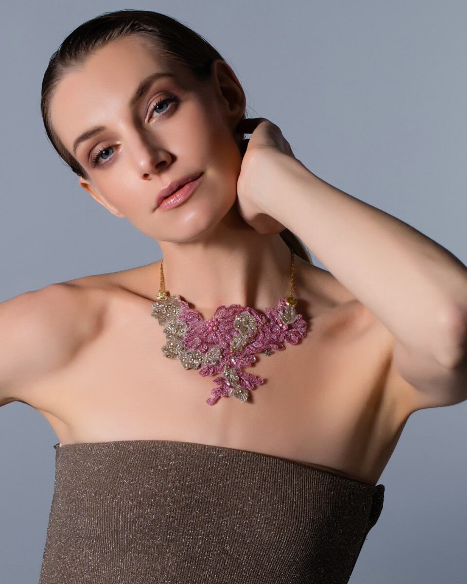 Una collana realizzata a mano con due tipi di pregiati merletti, assemblati con la tecnica di upcycling d’autore. La forma irregolare e originale, unita alle tonalità rosa e argento, crea un gioiello delicato e luminoso.