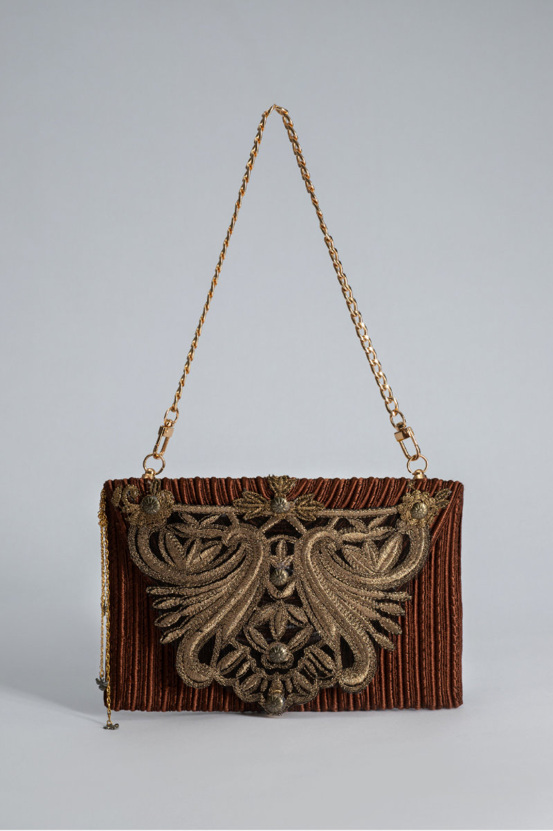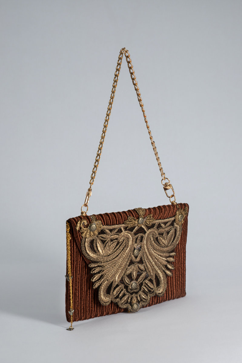 Borsetta realizzata con cucitura sartoriale e stoffa in filati di seta, che dona al colore marrone un raffinato effetto cangiante. Decorata a mano con un merletto riciclato in edizione limitata, oggi non più reperibile, lo stesso utilizzato per il Baciamano Casanova, con cui può essere abbinata.