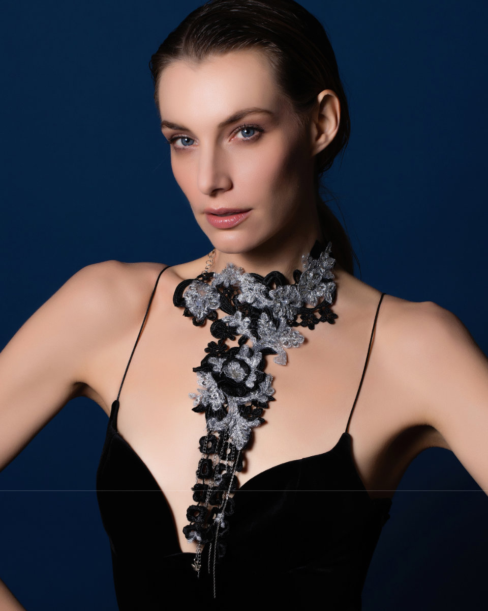 Un gioiello scenografico e tridimensionale, appartenente alla linea Movie, ispirato al cinema muto e al cinema d’autore. Realizzato con merletti vintage neri, ormai rari e introvabili, e dettagli in argento, questa collana-scultura avvolge il collo con un girocollo leggermente accollato e si estende fino al seno, arricchita da pendagli che aggiungono movimento e teatralità.