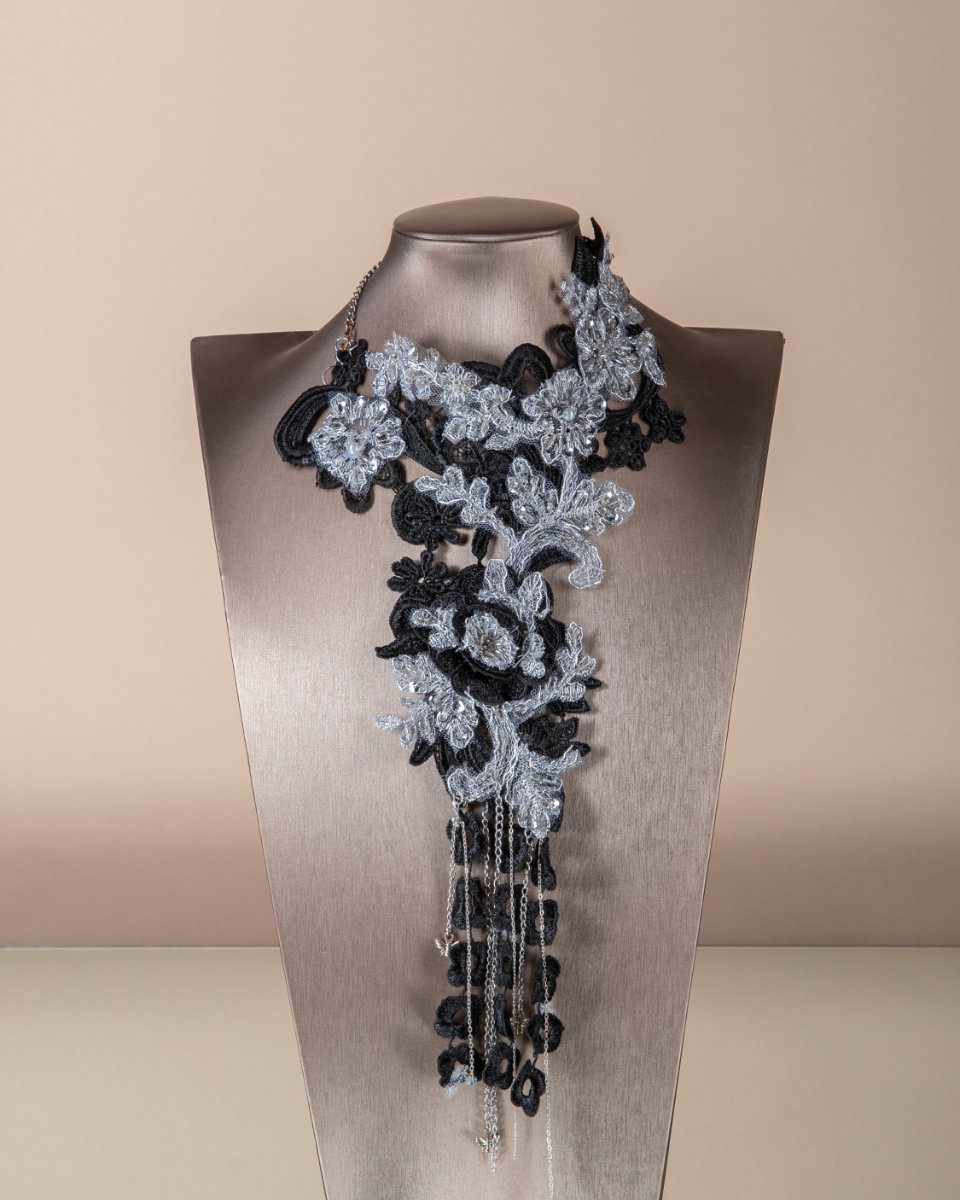 | Materiali | merletto in cotone nero, merletto ricamato a mano argenteo, catenine decorative placcate oro con ciondolini logo. Chiusura gioiello a calamita |