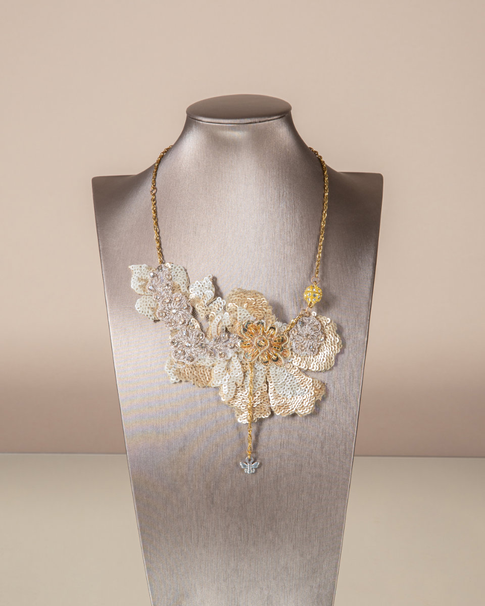 una collana di facile abbinamento, della linea azzardo, gioca con le asimmetrie conferendo un tocco di stile e originalità al proprio stile. realizzata con la tecnica dell’upcycling d’autore. merletti base di toulle ricamati con mini paillettes . modello di collana ripetibile, i merletti potrebbero variare.