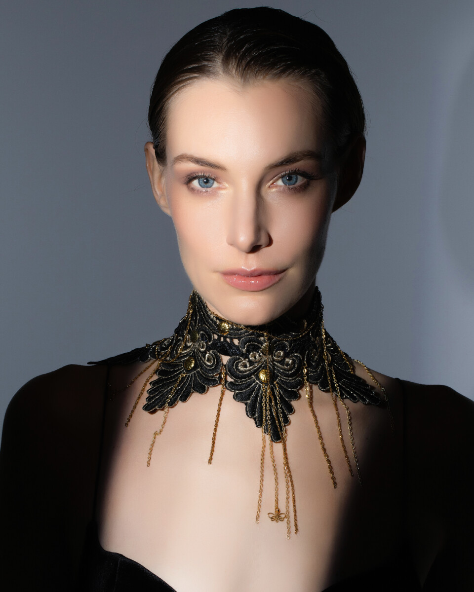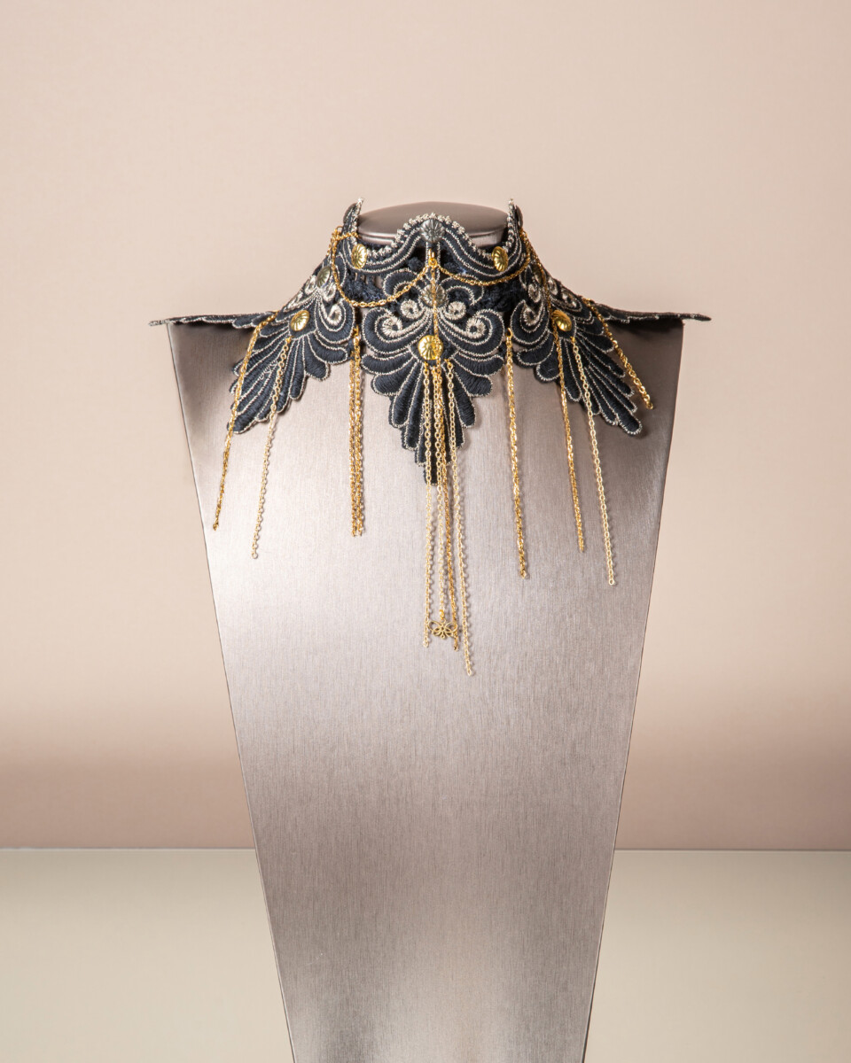 Un gioiello aderente al collo dalla forma strutturata e appuntita, realizzato interamente a mano in pregiato merletto. Ispirato all’immaginario delle regine guerriere e delle donne combattenti, il merletto a punte, simile a lance, crea una composizione forte e regale, evocando un’armatura ornamentale che incornicia il collo con forza e eleganza.