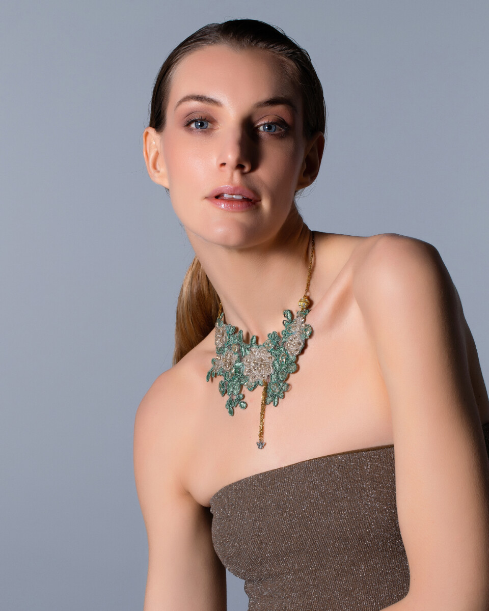 Una collana leggera e versatile, realizzata con un mix di merletti a base di tulle, confortevole da indossare, ipoallergenica e facile da trasportare, perfetta anche per i viaggi.
