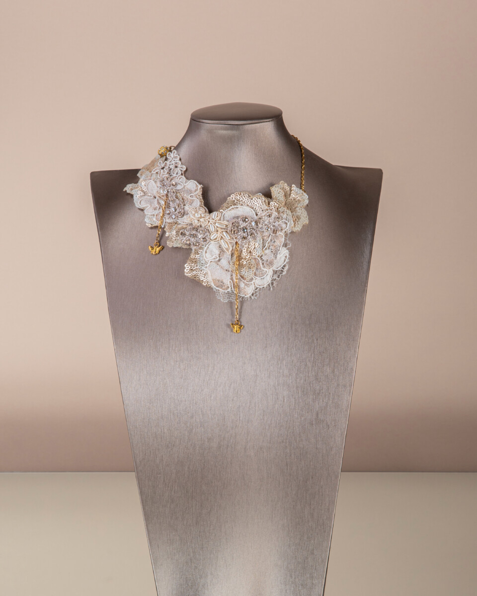 Collana realizzata con un raffinato mix di merletti ricamati e recuperati, arricchita da mini paillettes e delicati inserti di piccoli strass.
