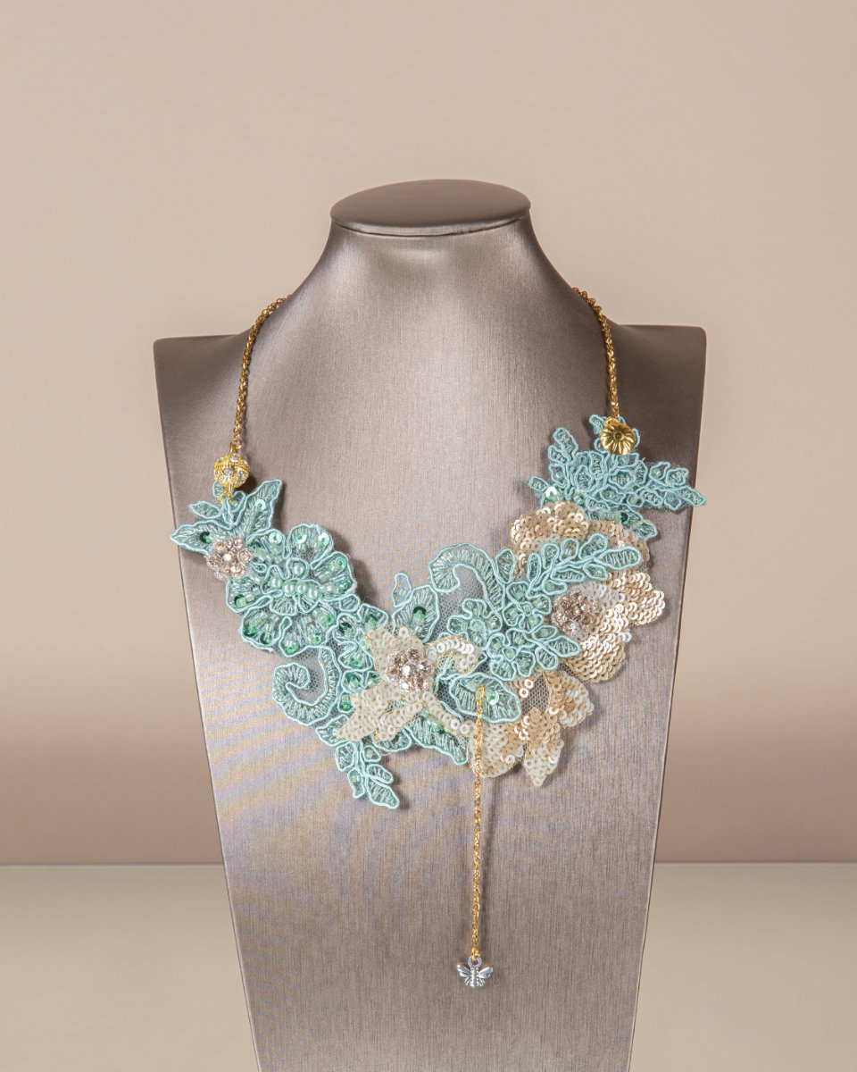 Realizzata con la tecnica dell’upcycling d’autore, presenta merletti su base in tulle ricamati con mini paillettes.