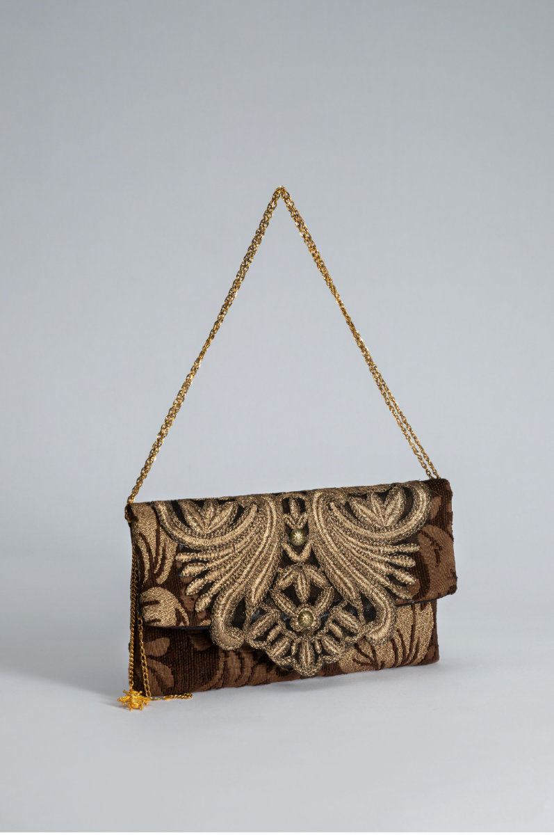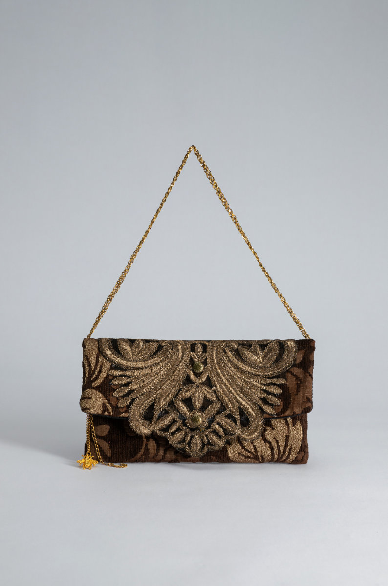 Borsetta realizzata con cucitura sartoriale in prezioso velluto damascato riciclato. Decorata a mano con un merletto anch’esso riciclato, oggi non più reperibile, lo stesso utilizzato per il Baciamano Casanova, con cui può essere abbinata.