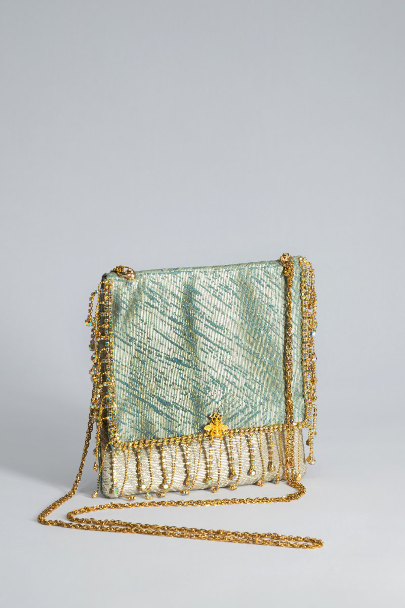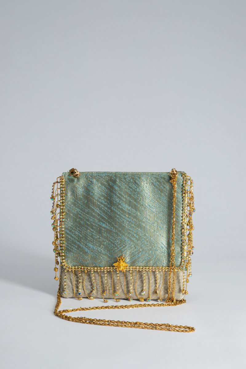 Borsetta artigianale realizzata e decorata interamente a mano con cucitura sartoriale, in due tipi di stoffe preziose, luminose e cangianti, provenienti da materiali riciclati.