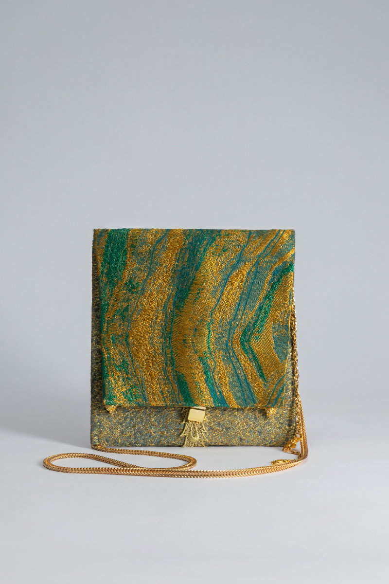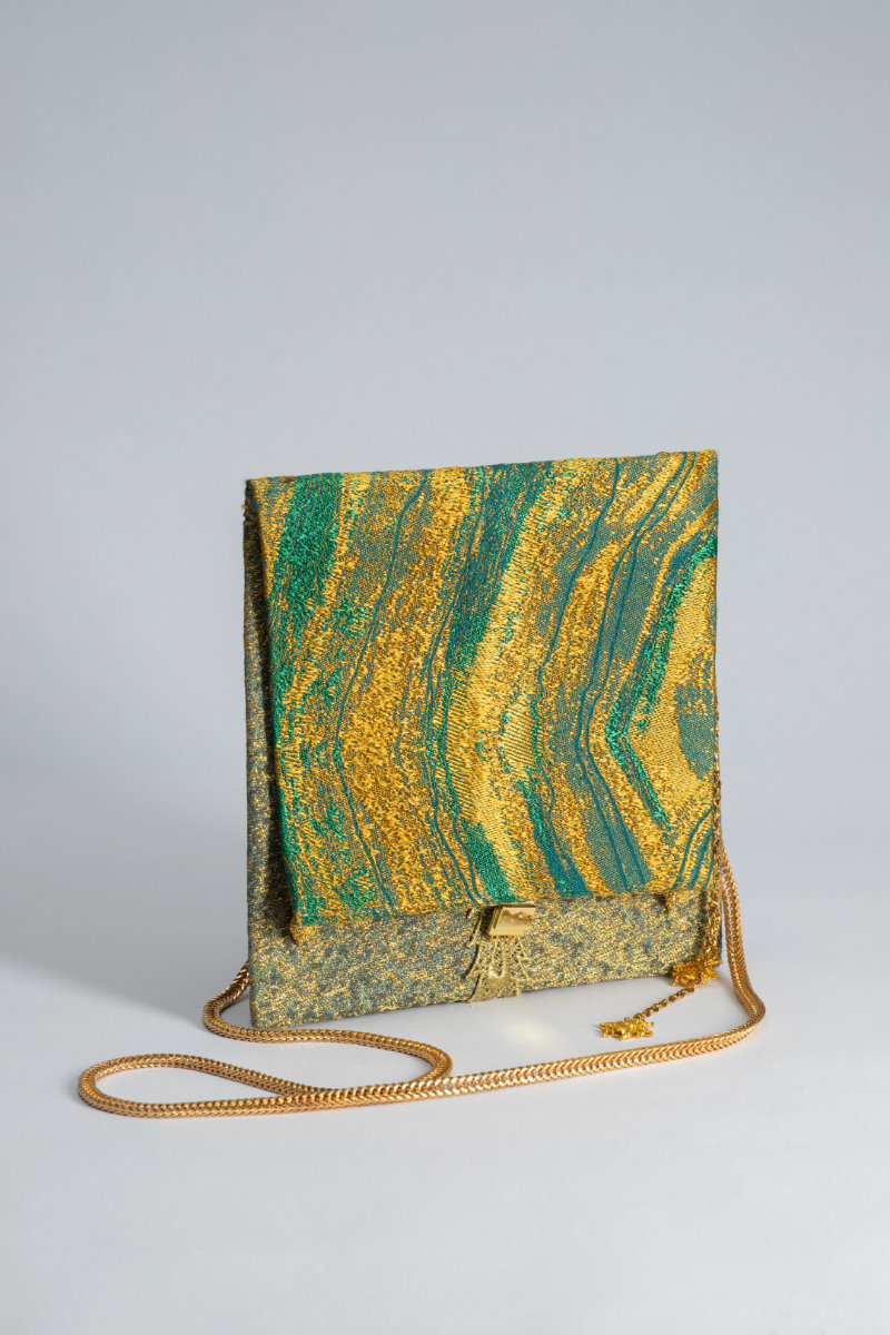 Pochette artigianale realizzata e decorata interamente a mano con cucitura sartoriale. È creata utilizzando due diverse stoffe pregiate, luminose e cangianti, provenienti da materiali riciclati, che rendono ogni pezzo unico e sostenibile.