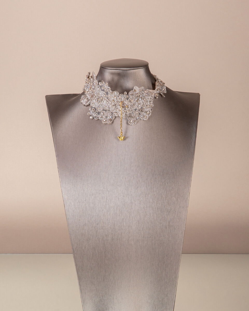 Collana realizzata con merletti ricamati, impreziositi da delicati mini strass.
