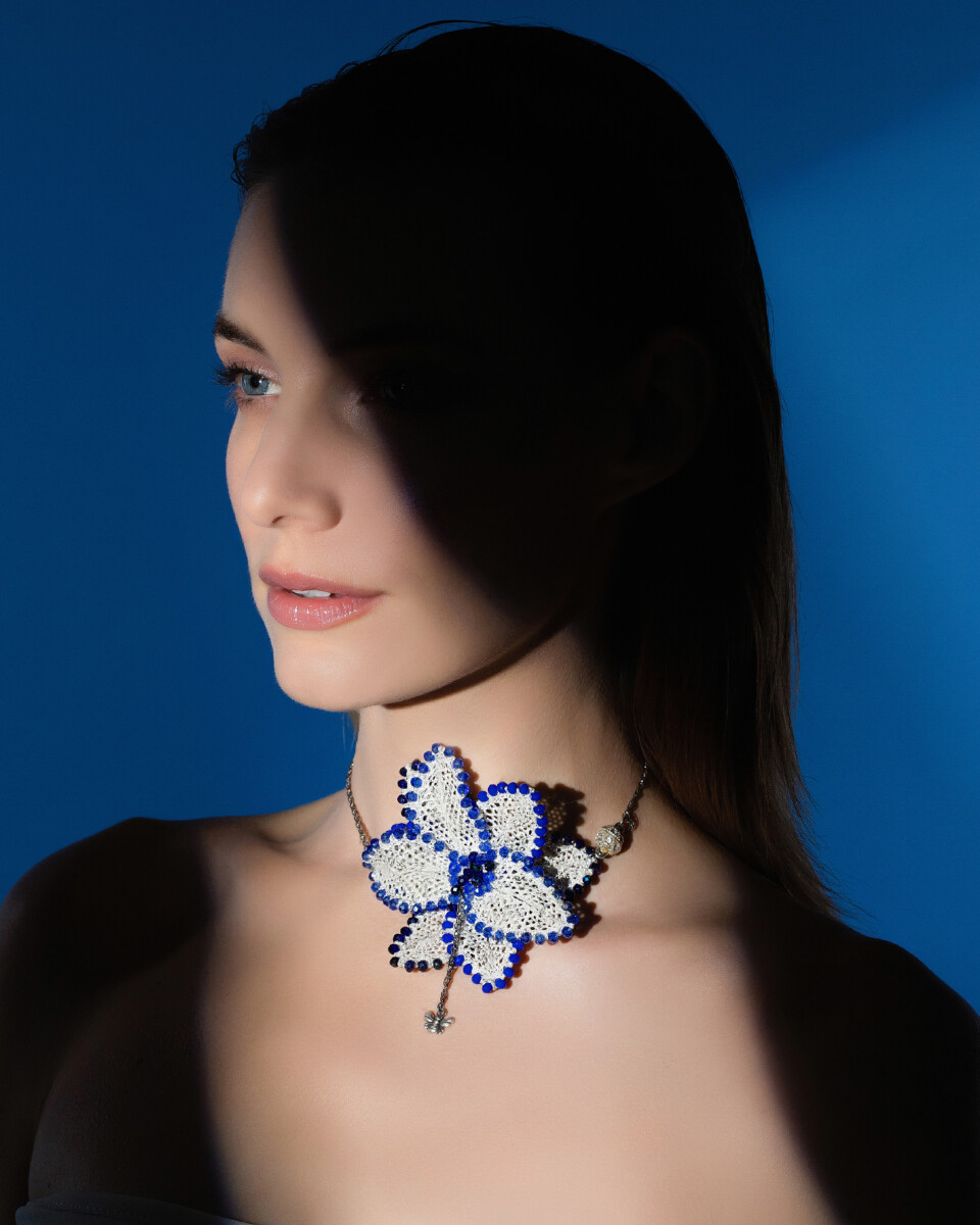 Un elegante gioiello aderente al collo, realizzato interamente a mano da esperte merlettaie con la tecnica del tombolo, utilizzando filati in cotone e delicate perle in cristallo. Il tombolo è l’antica arte artigianale di intrecciare filati con fuselli in legno di ciliegio seguendo un disegno prestabilito, trasformando ogni creazione in un piccolo capolavoro di precisione e bellezza.